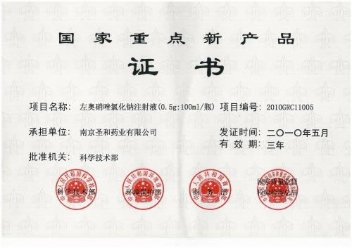 2010國(guó)家重點(diǎn)新產(chǎn)品證書—左奧硝唑