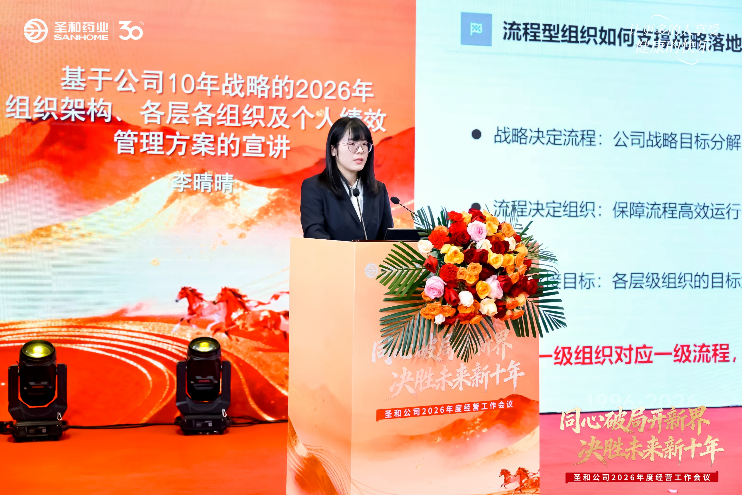 2026 年 1 月 24 日,圣和藥業(yè) 2026 年度經(jīng)營工作會(huì)議在南京圣和府邸豪華精選酒店隆重召開。作為企業(yè)深耕醫(yī)藥行業(yè)三十載、邁向新十年征程的關(guān)鍵節(jié)點(diǎn),本次會(huì)議以 “同心破局開新界,決勝未來新十年” 為核心主題,匯聚 2025 年度部分受表彰人員、各級(jí)管理人員及研發(fā)高級(jí)研究員現(xiàn)場(chǎng)參會(huì),其余員工通過 “圣和藥業(yè)”視頻號(hào)線上同步參與。會(huì)議主要由產(chǎn)品與創(chuàng)新體系負(fù)責(zé)人張小猛與人力資源總監(jiān)李晴晴主持,聚焦戰(zhàn)略落地與責(zé)任傳遞,全程緊湊務(wù)實(shí)、凝心聚力。