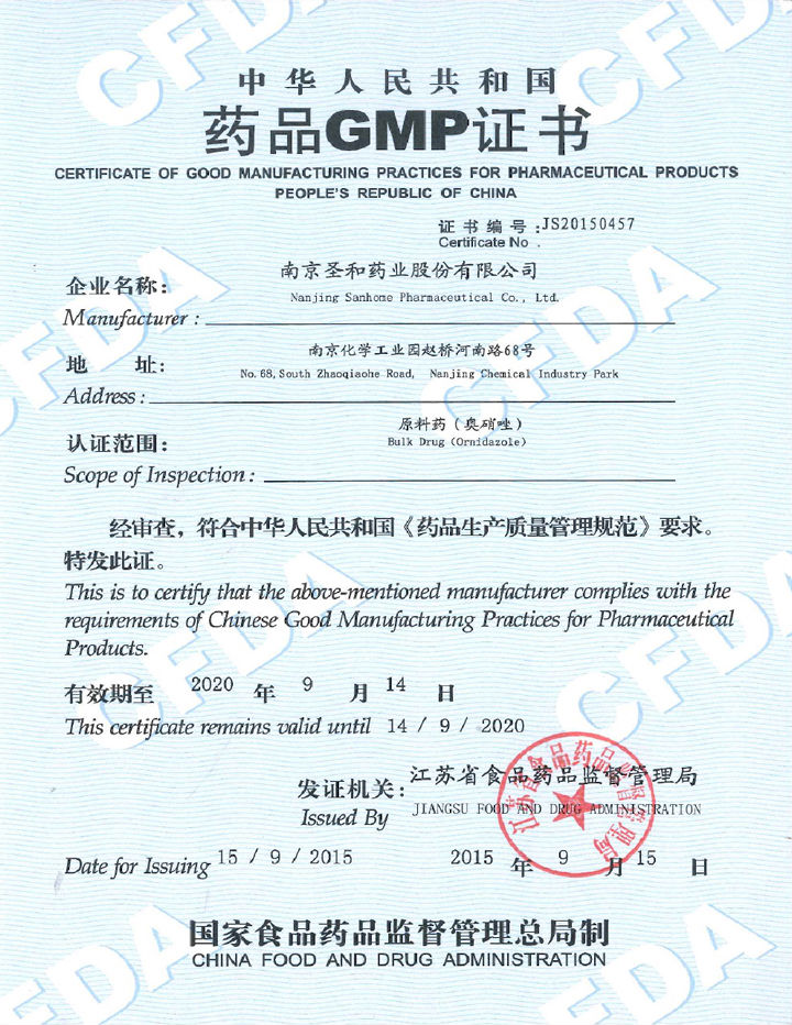 In September 2015, API (ornidazole) GMP certification, certificate number: JS20150457